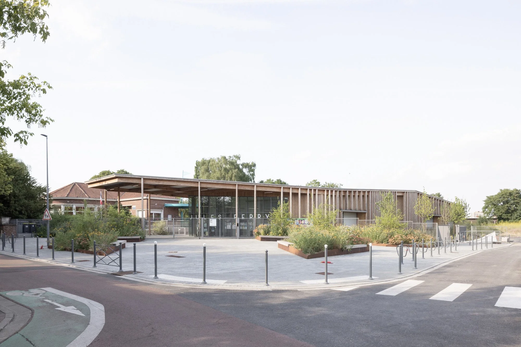 L’école élémentaire Jules Ferry prend place au cœur d’un parc arboré. Il forme avec l’école maternelle La Fontaine, le nouveau groupe scolaire de Hem. L’entrée en pan coupé, libère un généreux parvis rue de l’abbé Lemire et accueille les piétons de façon sécurisée. L’équipement volontairement compact, permet d’atteindre les performances thermiques souhaitées et offre des espaces pédagogiques qui se déplient entre les arbres, à l’aide de patios.